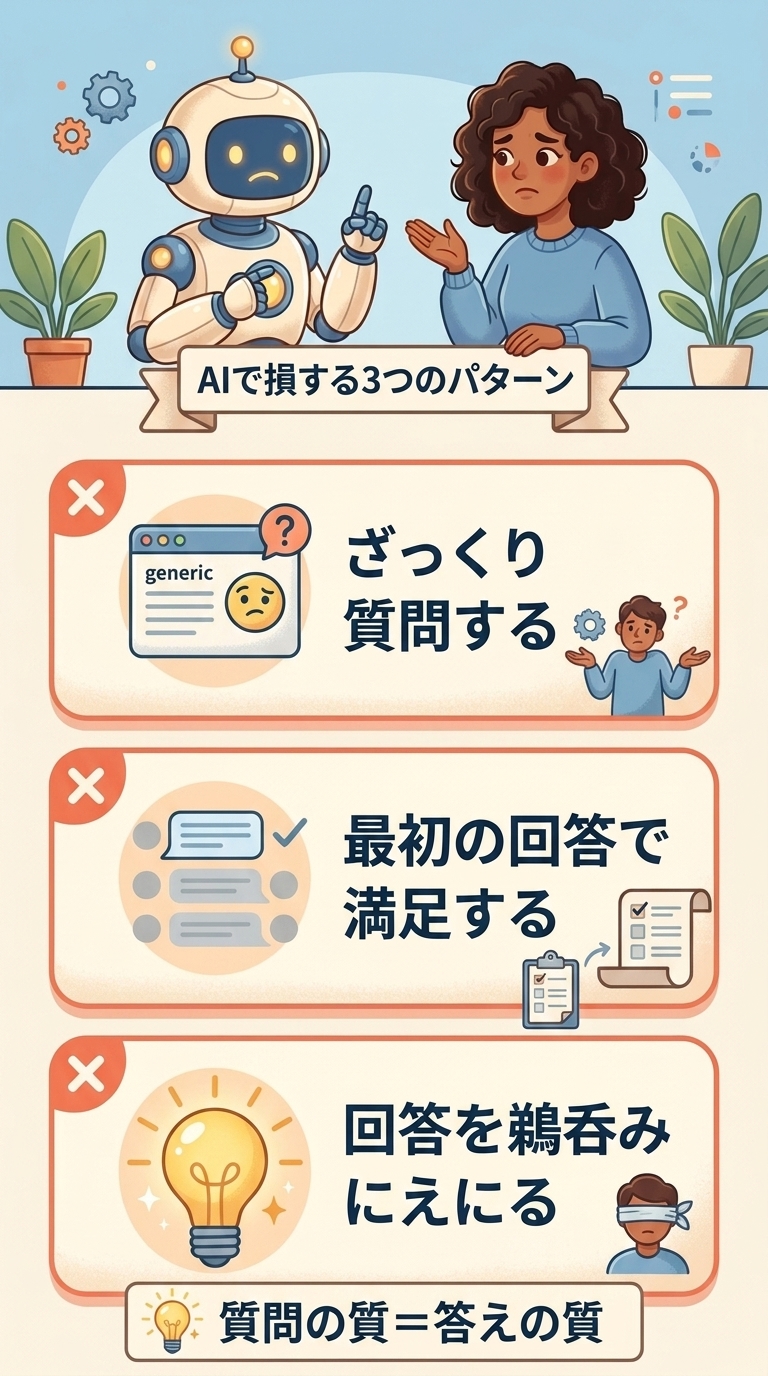 もうひとつのパターンは、AIの最初の回答で満足してしまうことです。AIとの対話は一問一答ではなく、会話を重ねることで精度が上がっていきます。「もう少し具体的に」「別の視点でも教えて」と掘り下げる姿勢がないと、AIの本来の力を引き出せません。