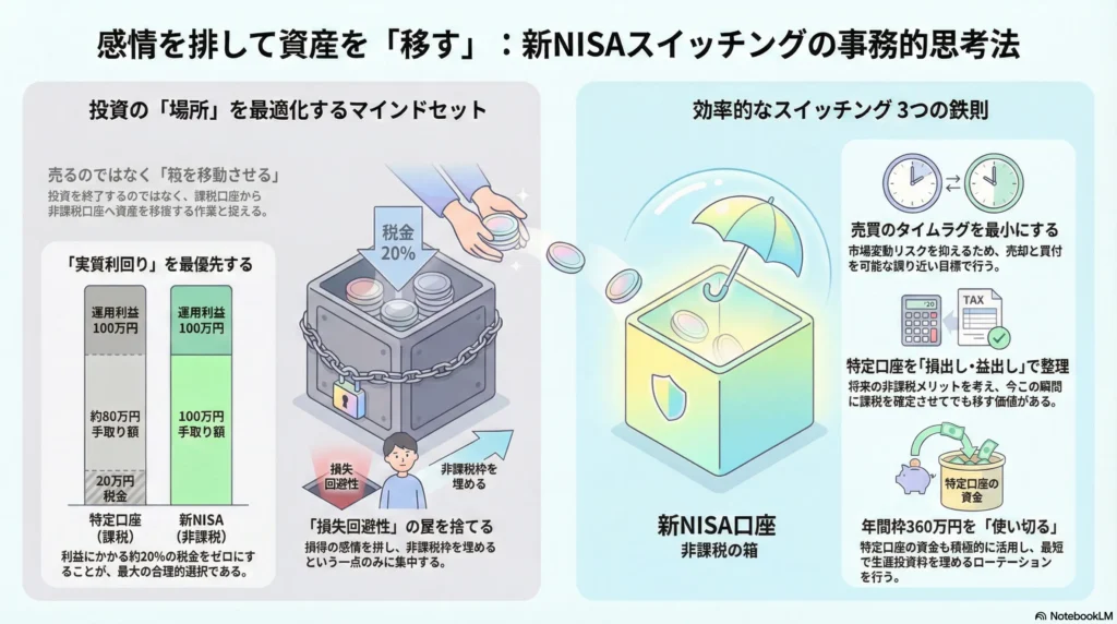 なぜなら、これは**「投資を終了する売却」ではなく、「より有利な箱(口座)へ資産を移動させる作業」**だからです。