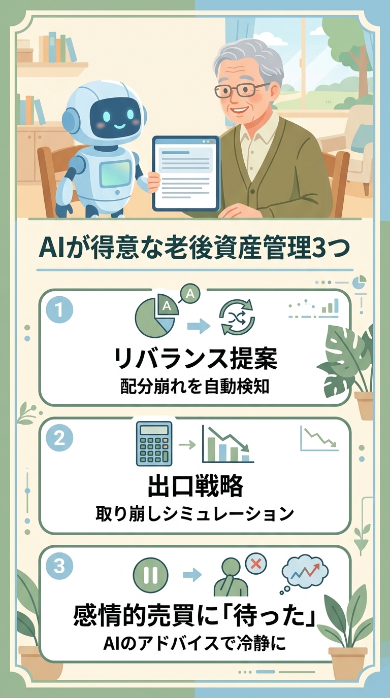 老後の資産管理において、AIは人間の感情的弱点を補う最強のパートナーです。相場の波に飲み込まれそうになったとき、AIに問いかける一歩が、長期的な資産保全につながります。完全にAIに任せる必要はありません。「判断の前にAIに相談する」習慣をつけるだけで、老後の資産管理は大きく変わります。