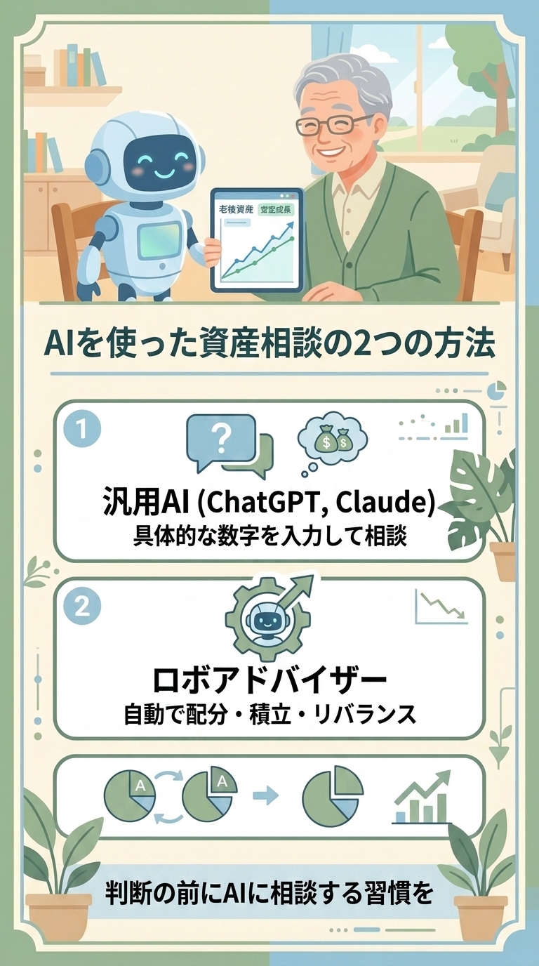 汎用AI(ChatGPT・Claude):保有資産の状況を入力してアドバイスを求める使い方が中心です。プロのファイナンシャルプランナーに相談するような感覚で、無料〜月数千円で利用できます。重要なのは「具体的な数字を入力する」こと。「老後が不安です」ではなく「65歳、資産3000万円、月の生活費22万円、公的年金18万円見込み」と伝えると、精度の高いアドバイスが返ってきます。