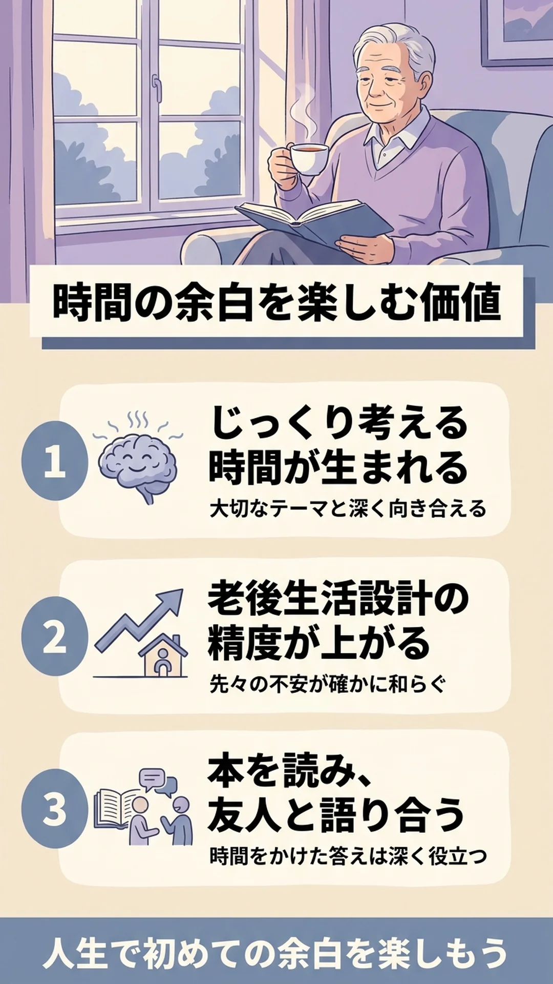 これまで「考えたい」と思いながらも、日々に追われて考えられずにいたこと——老後の生活設計、これからの生き方、家族との時間の使い方——そういった大切なテーマを、じっくり考えられるようになったのです。