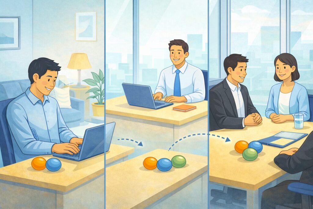 非同期の仕事とは、相手が今オンラインでなくても、仕事が進むように、情報を文章や資料に残して各自が都合のいいタイミングで処理する進め方です。リモート/ハイブリッドが増えた今は、「すぐ返事が来る前提」で段取りを組むと、返事待ちがそのまま渋滞になります。