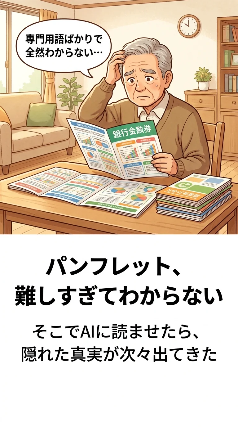 【本記事について】 このシリーズは、定年退職後に銀行の窓口で実際に受け取ったパンフレットを、AIに読み込ませて検証した記録です。当時は「なんとなく割に合わない気がする」という直感で見送った商品もありました。AIで改めて数字を検証してみると、あの時の直感が正しかったことが、はっきりと裏付けられました。会話の細部は読みやすさのために再構成していますが、商品の数値データと検証結果はすべて実際のものです。 実際のパンフレットやデータを使用していますが、会話パートなどはAI活用をわかりやすく伝えるための構成となっています。