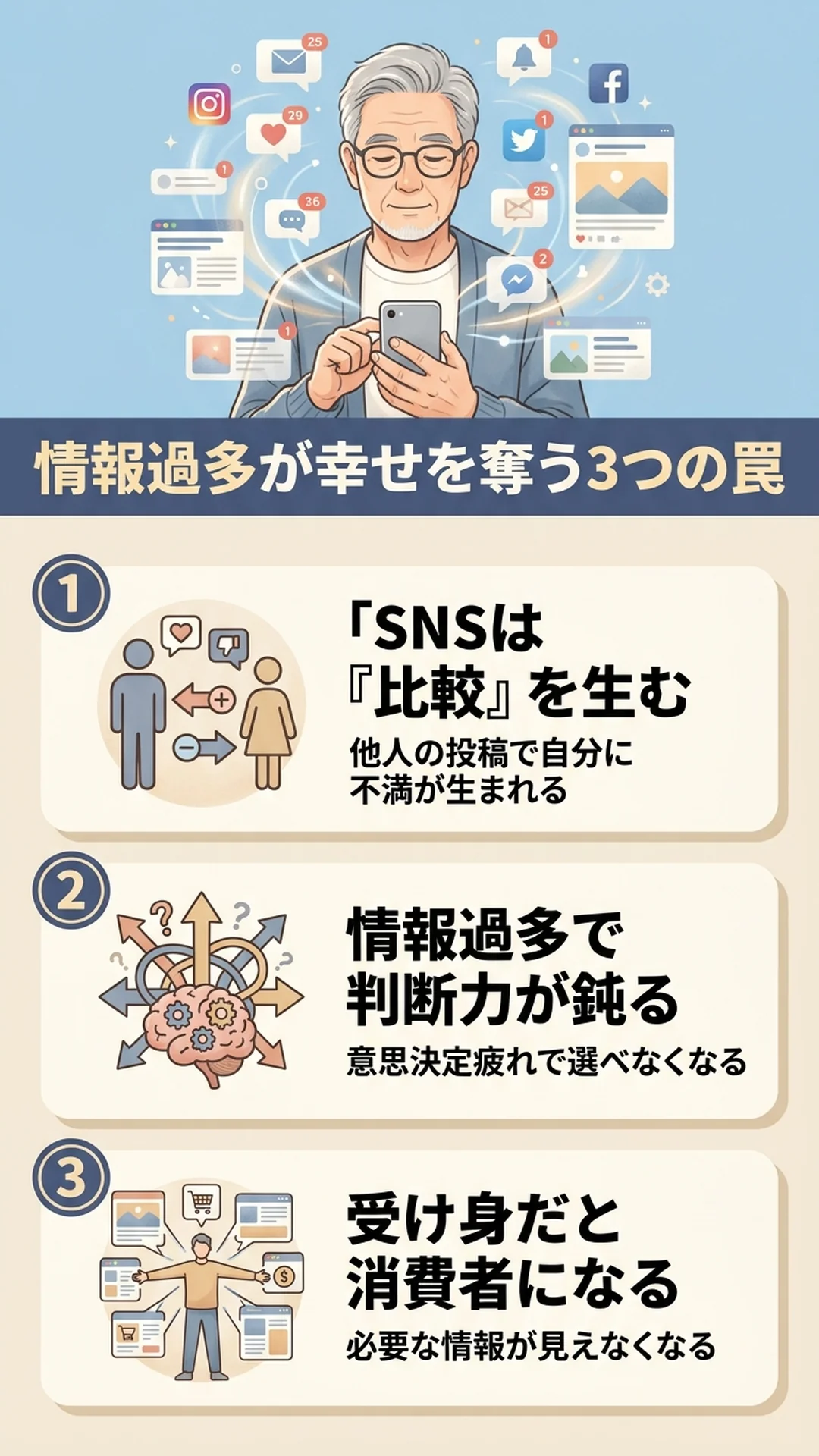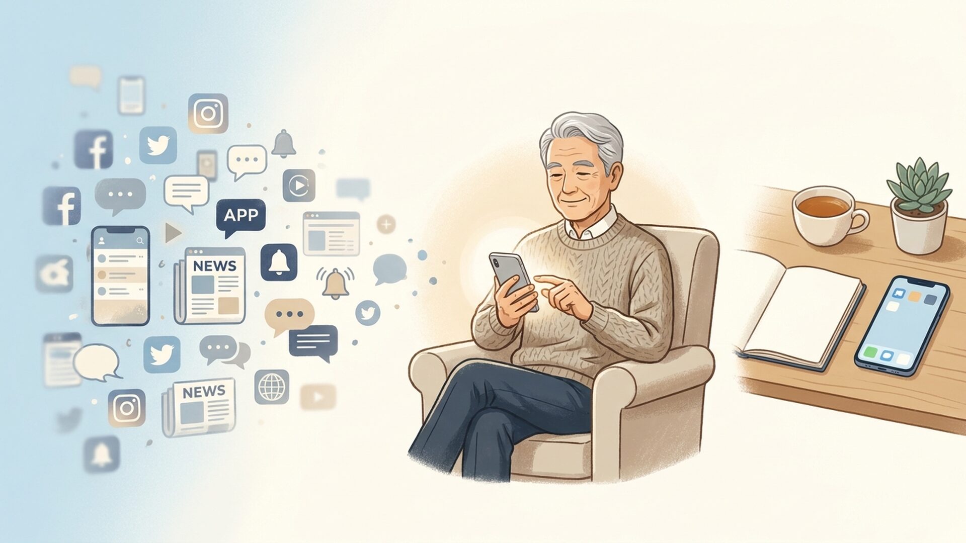 「情報は多いに越したことはない」——かつての私は、そう信じて疑いませんでした。スキマ時間があれば、スマホを開き、何か有益な情報はないかと探し回る。定年退職後、時間に余裕ができてからは、さらに情報収集に時間を費やすようになりました。