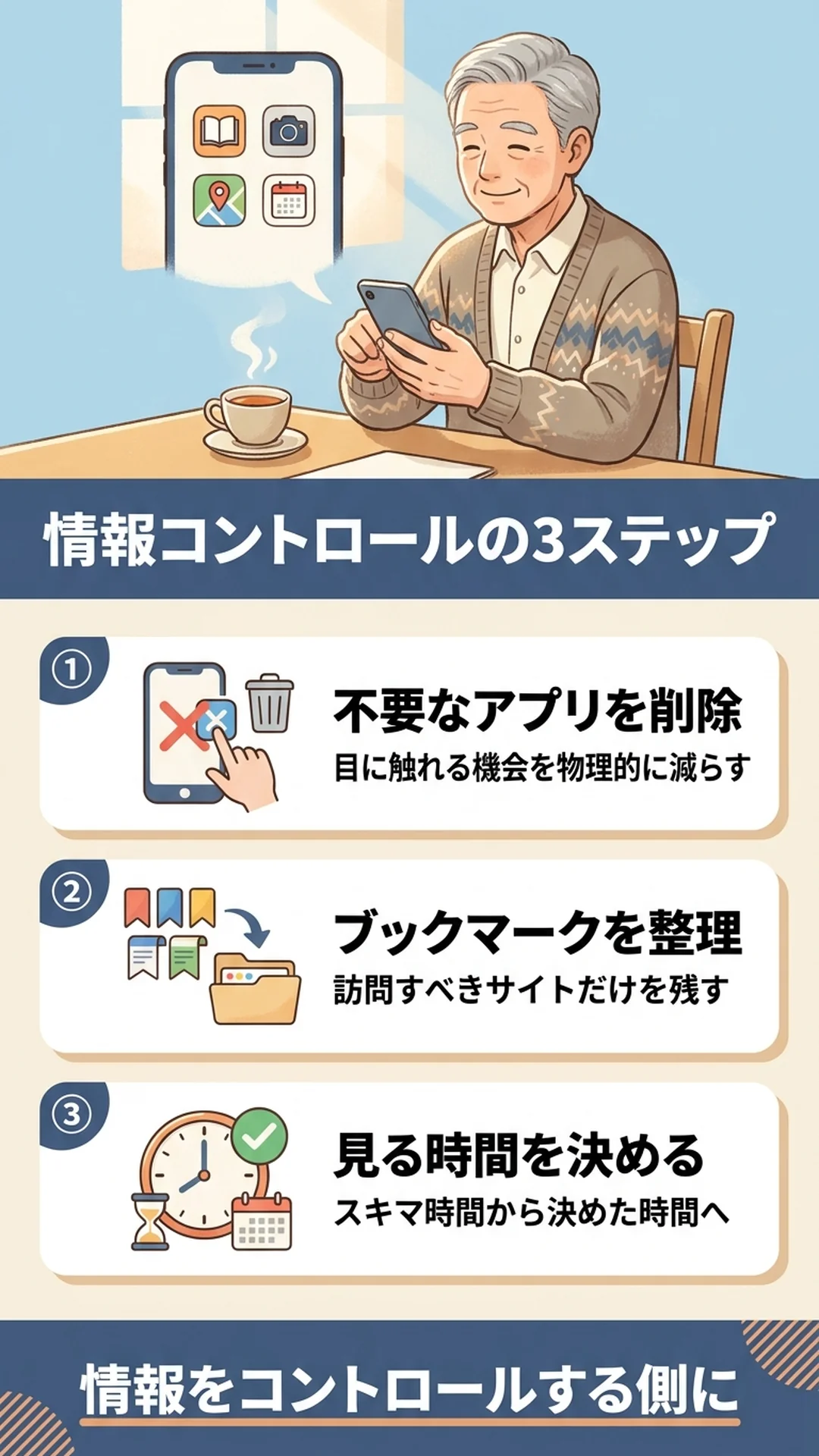 情報過多の時代において、幸せに生きるカギは「情報コントロール」の姿勢にあります。受け身で情報を浴び続けるのではなく、必要な情報を能動的に選び取る。この小さな転換が、心のゆとりと思考の明晰さを取り戻してくれます。