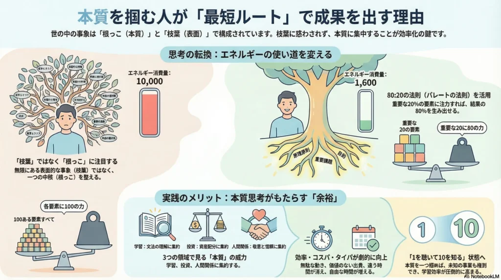 なぜ、本質を知っている人はいつも余裕があり、少ない努力で大きな結果を出せるのか。その仕組みを、原理原則から具体例まで、分かりやすく紐解いていきましょう。