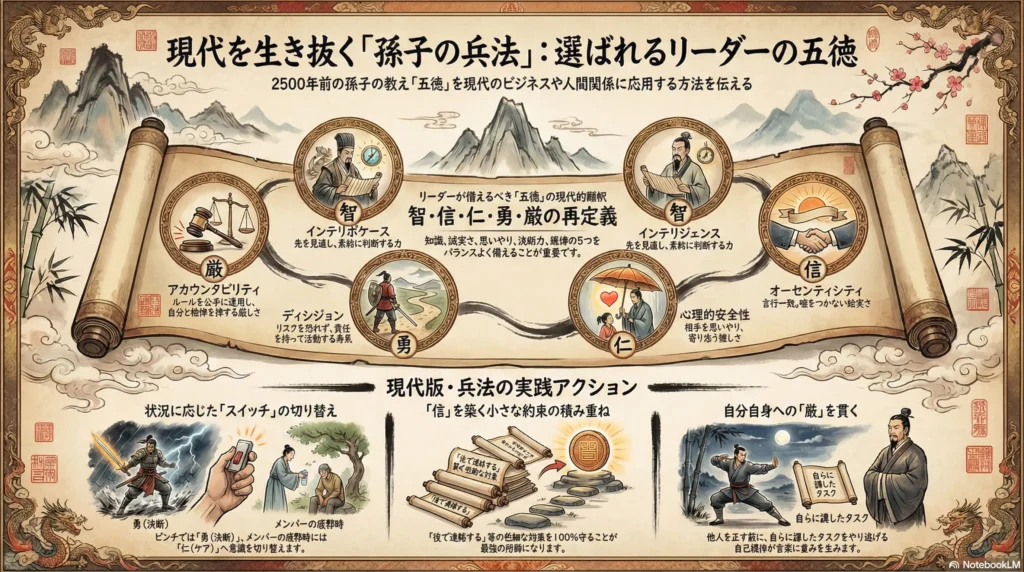 仕事のプロジェクト、部活動、あるいは家族や友人関係。私たちは常に誰かと関わって生きています。そこで問われるのが「リーダーシップ」です。孫子は、優れたリーダー(将軍)が備えるべき5つの条件として、**「智・信・仁・勇・厳(ち・しん・じん・ゆう・げん)」**を挙げました。