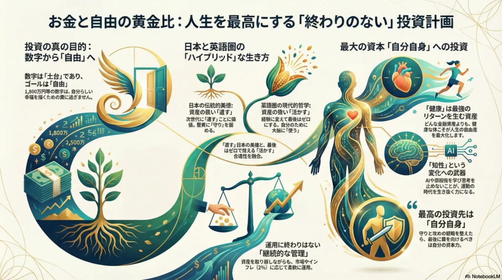私たちの目指すべきは、その中間かもしれません。 堅実に「守り」を固めつつ、せっかく育てた資産を自分の幸福のために大胆に「使う」。日本の安定感と、英語圏の合理性を掛け合わせた**「ハイブリッドな投資人生」**。これが、今の時代を生きる私たちにとって最も心地よい着地点ではないでしょうか。