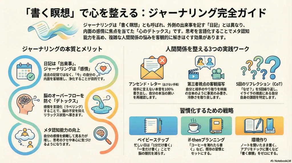 日記が「出来事のアルバム」だとしたら、ジャーナリングは**「脳と心のデトックス」**です。自分を苦しめている思考のクセに気づき、自分をアップデートするための作業なのです。