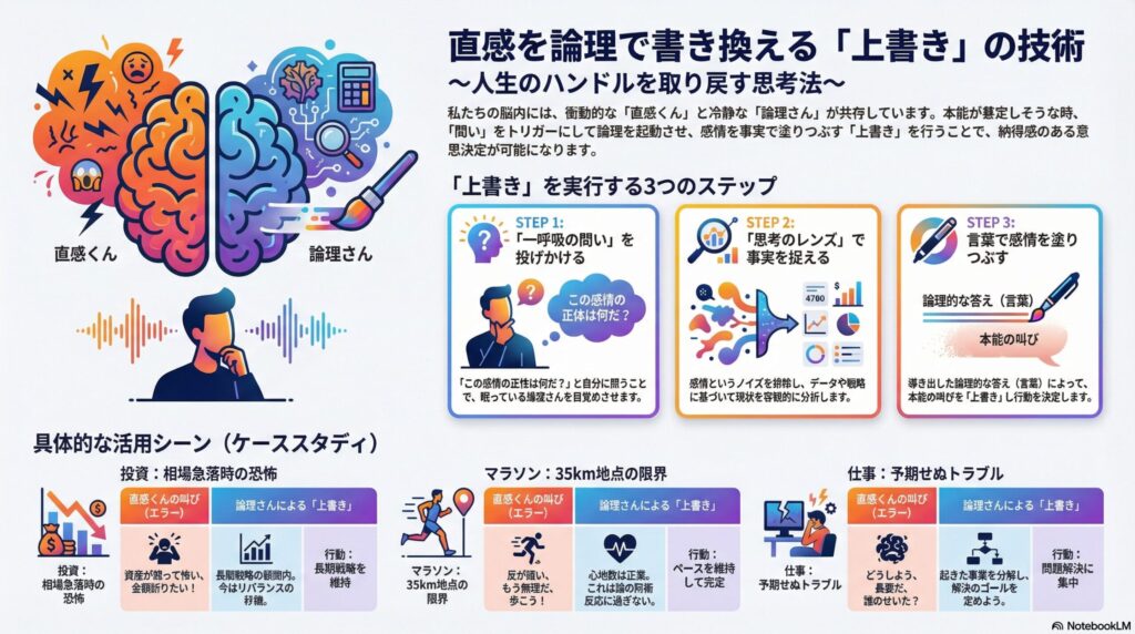 このように、感情という「ノイズ」を、事実と論理という「言葉」で塗りつぶしていく。これが**「上書き(オーバーライト)」**の正体です。