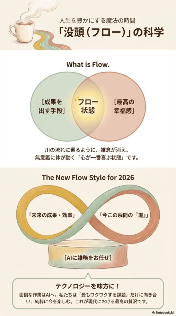 AIに細かな事務作業やリサーチを任せ、自分は「最もクリエイティブで、最もワクワクする課題」だけに集中する環境を作ること。これこそが、現代における最高の贅沢であり、フローへの近道です。