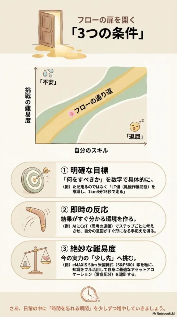 「明確な目標」「即時の反応」「絶妙な難易度」。 この3つの条件を意識して、あなたの日常の中に「時間を忘れる瞬間」を少しずつ増やしていきませんか。