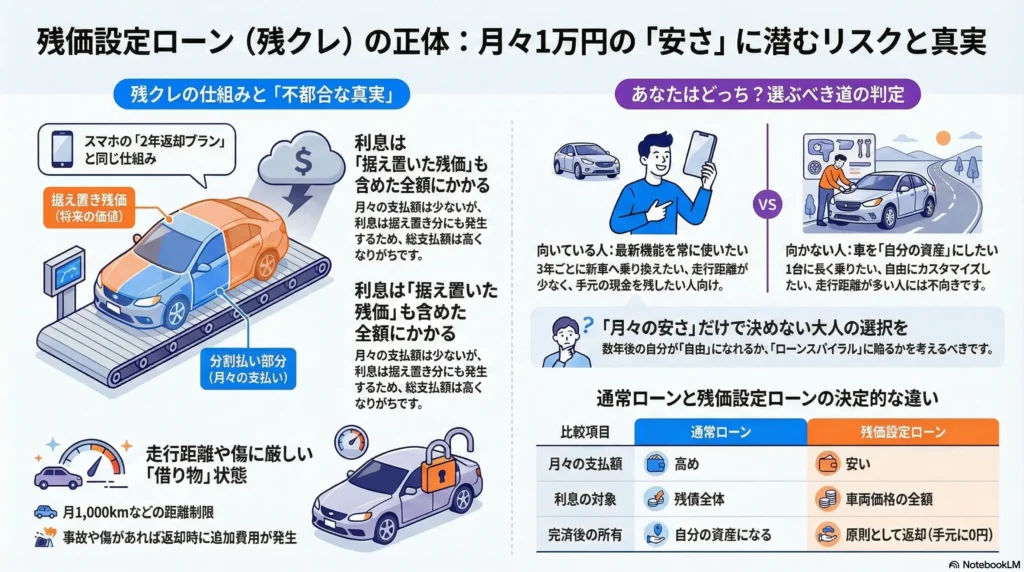普通のローンは、払い終われば車は100%自分のものになります。次に買い換えるとき、その車を売って「次の車の資金」にできます。 しかし、残クレで車を返却した場合、**手元に残るお金は「0円」**です。またゼロからローンを組むことになり、一生支払いが終わらない「ローンスパイラル」に陥るリスクがあります。