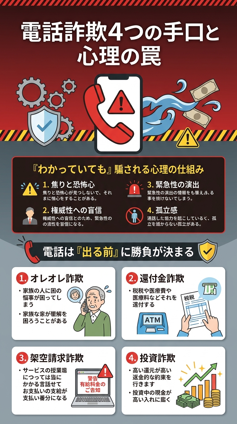 現代の詐欺は、相手の「恐怖」「焦り」「親切心」を巧みに利用します。
