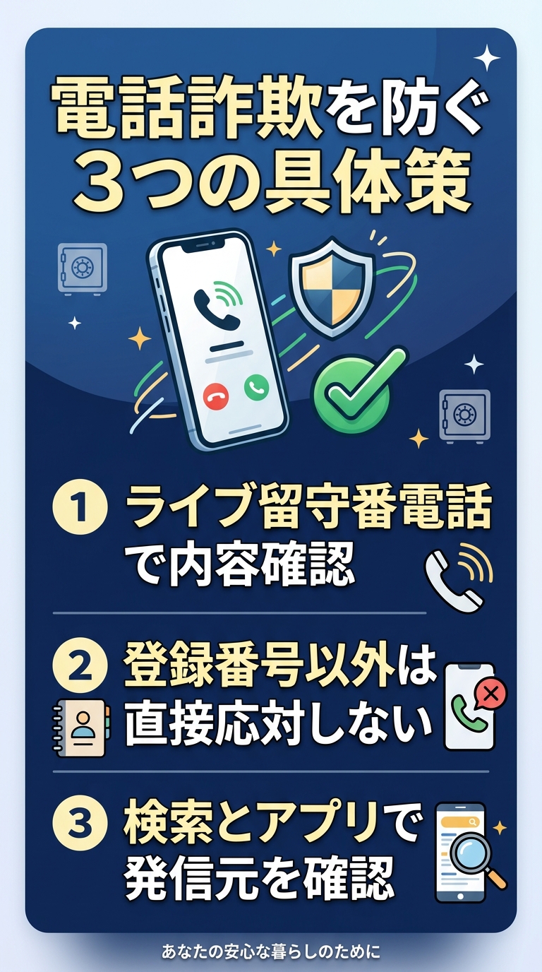 • 電話帳に登録していない番号からの着信は、**「まず出ない」**を徹底します。