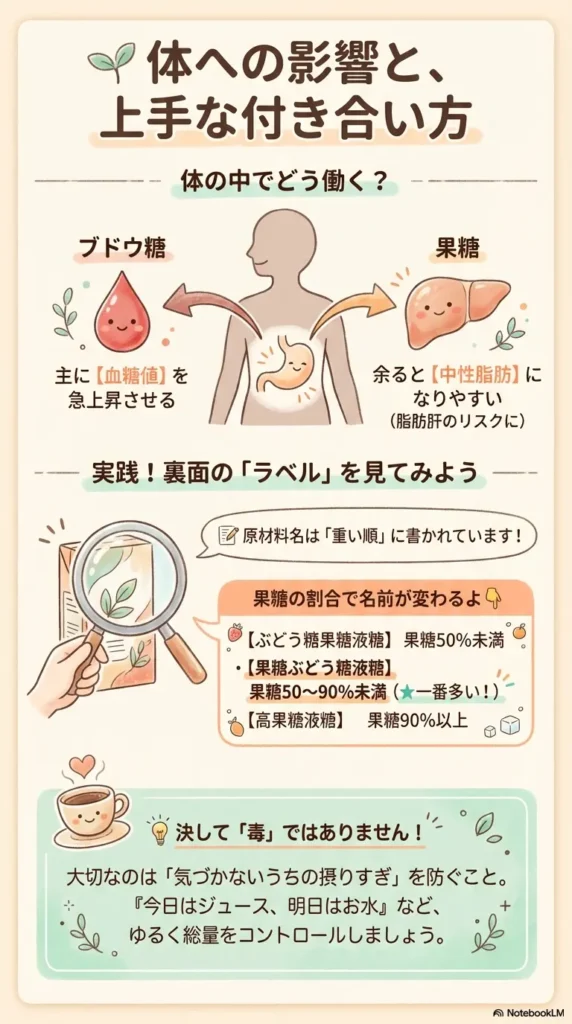 • 血糖値への影響: 血糖値を直接上げるのは主に「ブドウ糖」です。果糖そのものは血糖値を上げにくい性質がありますが、液糖にはブドウ糖も含まれているため、飲みすぎれば当然、血糖値に影響します。