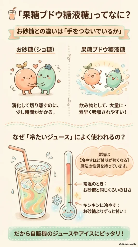 それは、成分である「果糖」の**「冷やすと甘味が増す」**という性質です。砂糖は温度が変わっても甘さの感じ方が一定ですが、果糖を多く含む液糖は、キンキンに冷やすことでより強く甘みを感じるようになります。そのため、自動販売機のジュースやスポーツドリンク、アイスクリームに非常に適しているのです。