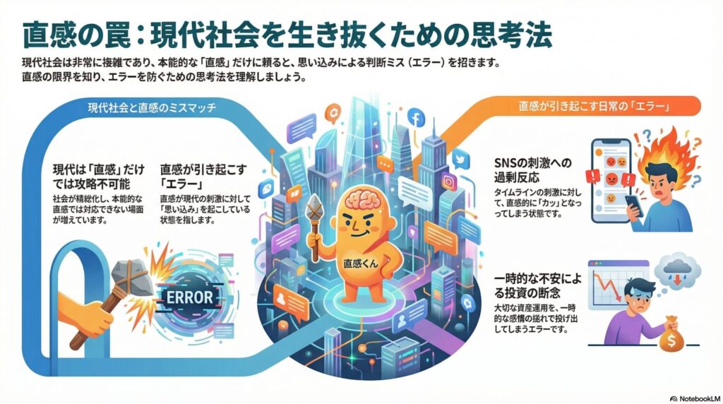 現代社会は、この「直感くん」だけでは攻略できないほど複雑になっています。 SNSの刺激にカッとなったり、一時的な不安で大切な投資を投げ出したり……。これらはすべて、直感くんが「エラー(思い込み)」を起こしている状態です。