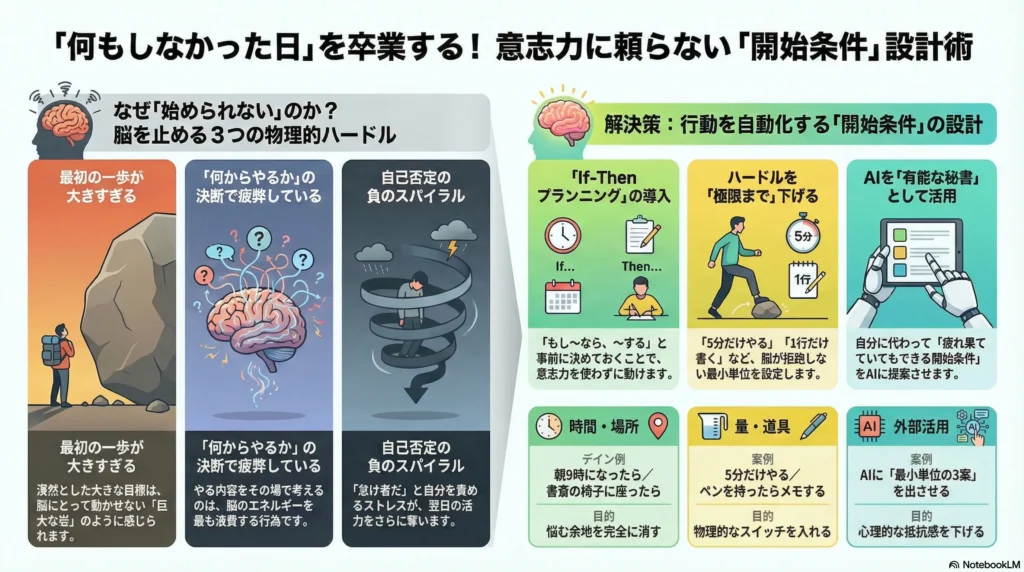 夜、布団の中でため息をつきながら自分を責めてしまう。そんな経験はありませんか?しかし、安心してください。あなたが動けなかったのは、根性がないからでも、能力が衰えたからでもありません。ただ、脳が「いつ、どうやって動けばいいか」の指令を待ちぼうけていただけなのです。