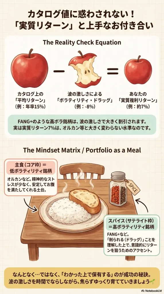 FANG+を保有し続けることの意味は、「高いボラティリティを時間でならす」という長期投資の本質的な戦略に沿っています。しかし、それはボラティリティ・ドラッグの存在を理解した上で許容するという、意識的な選択である必要があります。