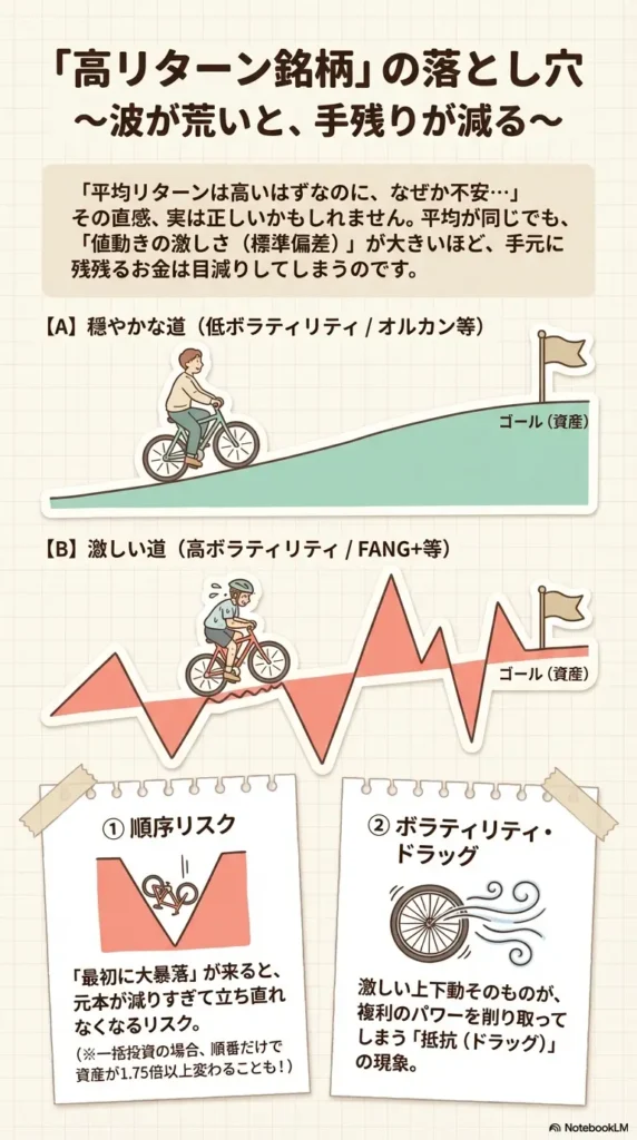 標準偏差が大きいほど、上下の振れが大きくなります。そして振れが大きくなるほど、「ボラティリティ・ドラッグ」と呼ばれる現象によって、実質的な複利成長が目減りします。