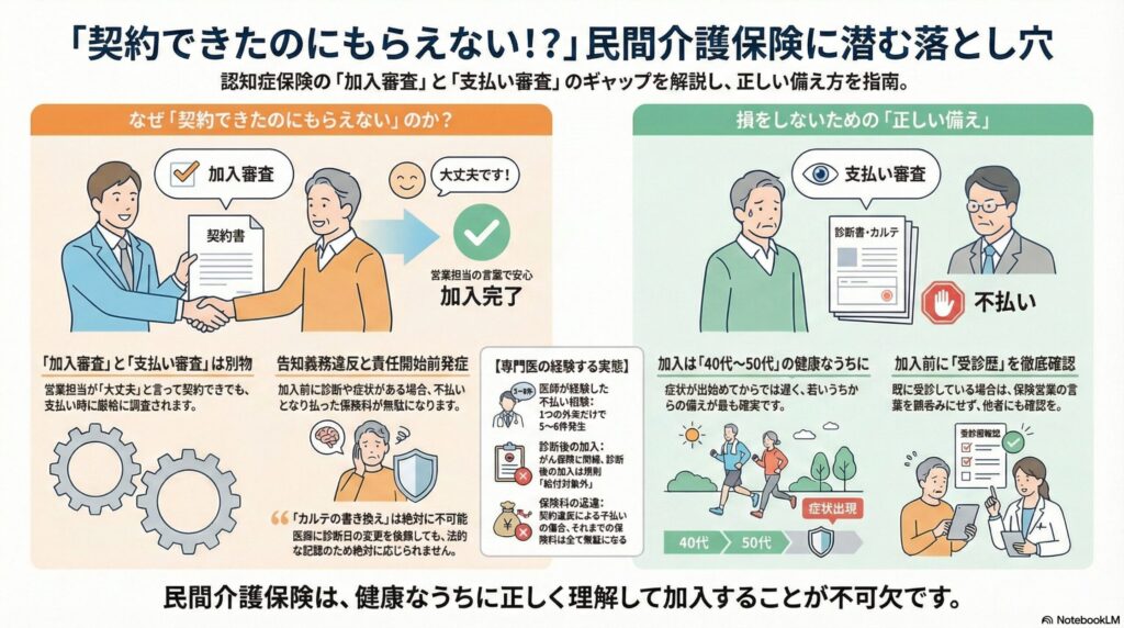 「高齢でも入れる」「審査が緩い」といった営業担当者の言葉を信じて加入した民間介護保険。しかし、いざ介護が必要になった時に「1円も支払われない」という悲劇が、病院の現場で多発しています 。