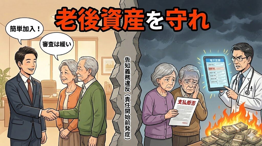 - 入り口(加入審査): 営業担当者は契約を取ることが仕事であり、「高齢でも大丈夫」「審査は緩い」と加入を促します 。